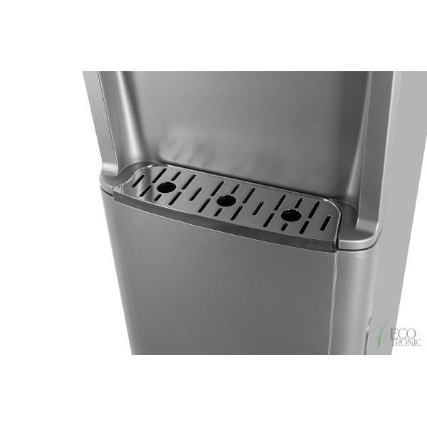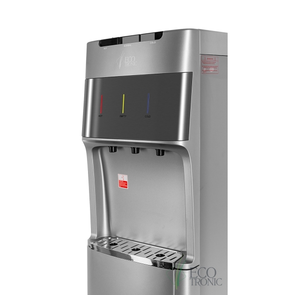 Кулер с нижней загрузкой бутыли и электронным охлаждением. Корпус серебристого цвета со вставкой из нержавеющей стали. 3 клавиши подачи воды (горячая/комнатной температуры/холодная). Клавиша горячей воды с защитой от детей. Индикация режимов нагрева, охлаждения воды, а также индикация отсутствия воды в бутыли. Для быстрой очистки краников применяются съемные гигиенические колпачки