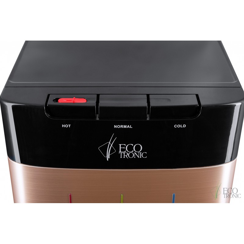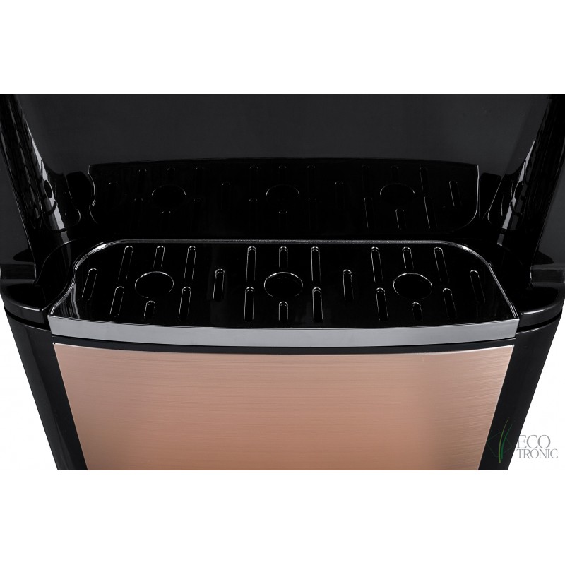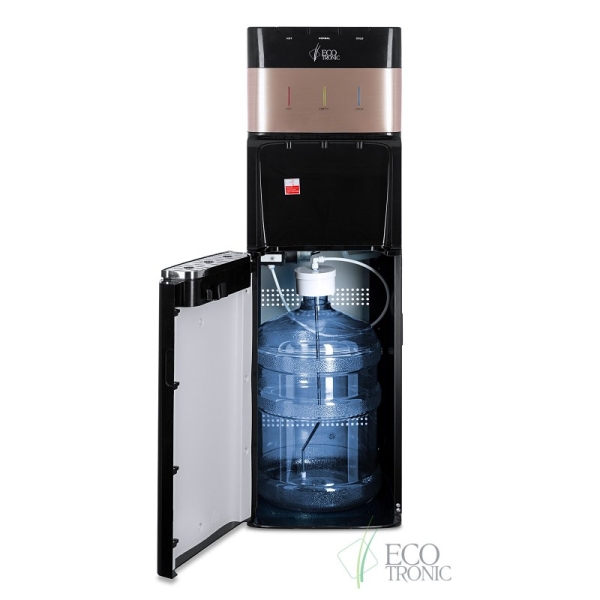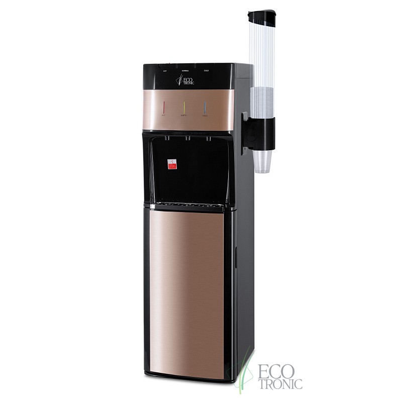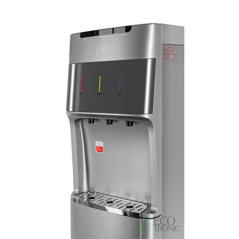 Кулер с нижней загрузкой бутыли и электронным охлаждением. Корпус серебристого цвета со вставкой из нержавеющей стали. 3 клавиши подачи воды (горячая/комнатной температуры/холодная). Клавиша горячей воды с защитой от детей. Индикация режимов нагрева, охлаждения воды, а также индикация отсутствия воды в бутыли. Для быстрой очистки краников применяются съемные гигиенические колпачки