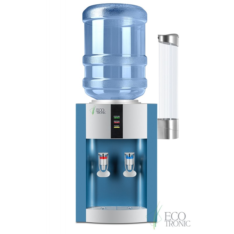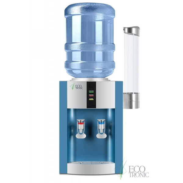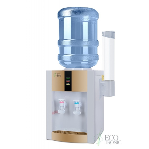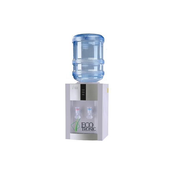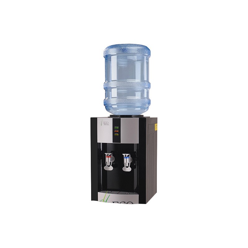 Настольный кулер с электронным охлаждением. Краны «нажим кружкой». Улучшенные качественные характеристики: более производительный блок эл. охлаждения, качественный бак емкостью 1.2 л. Отличие от дешевых аналогов - разборный бак горячей воды (не сварной) для простого и не дорогого ремонта в дальнейшем, штуцеры кранов из нержавеющей стали
